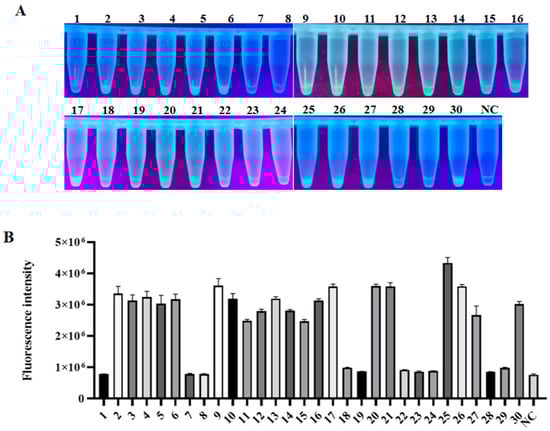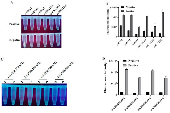 To achieve the best performance, a series of optimizations were performed for the CRISPR/Cas12a reaction. Briefly, crRNAs of three target sites were screened to induce optimal huLbCas12a shearing activity, and the concentration of huLbCas12a and crRNA was optimized from 250:250 nM to 250:500 nM. The CRISPR/Cas12 reaction system was comprised of 2 μL detection buffer (500 nM NaCl, 100 nM Tris-HCl, 100 mM MgCl2, 100 mM BSA, pH7.9), 2 μL LAMP amplification products, 2 μM FAM-BHQ1-labeled ssDNA reporter, and nuclease-free sterilization water up to 20 μL. The fluorescence intensity was measured by ABI QuantStudio 5 (Applied Biosystems, Thermo Fisher Scientific, Waltham, MA, USA) and the tube was observed under a gel imaging system with a UV channel in the 30th min.