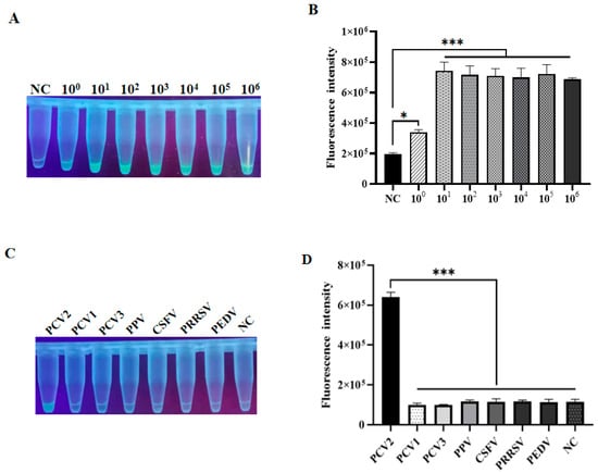 Fluorescence-based analysis of the sensitivity and specificity of LAMP-CRISPR. (A) Sensitivity of this method was determined by targeting various concentrations of pUCmT-rep plasmid. (B) The end-point fluorescent intensity was measured by ABI QuantStudio 5. (C) Visualization by UV light. (D) Florescence quantification after performing LAMP-CRISPR assay on DNA viruses individually including PCV1, PCV3, PPV, and PCV2, and RNA viruses like CSFV, PRRSV, and PEDV. NC: Negative control (n = 3 technical replicates, value represents mean ± SEM, where *, *** represent p < 0. 05, < 0.001, respectively).