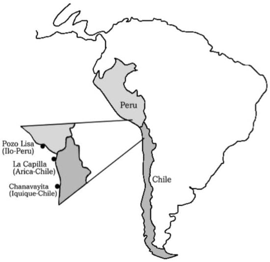 Between December 2013 and June 2014, individuals of Sarda chiliensis chiliensis (Figure 1) were collected by artisanal fishermen using purse seine off the coasts of (a) Pozo de Lisas, located seven kilometers south of the city of Ilo, Peru, (b) Playa La Capilla, located ten kilometers south of the city of Arica, Chile and (c) Playa Chanavayita, located sixty kilometers south of Iquique, Chile (Figure 2). Specimens were taken to the laboratory where they were identified based on meristic and morphometric characters proposed by Chirichigno [].