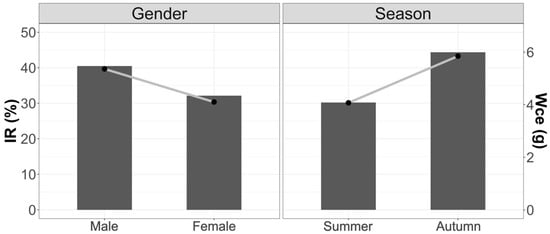 The results are expressed as a percentage of the weight of each food category versus the total weight of all stomach contents [].