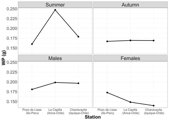 The trophic relationships of pelagic fishes with migratory characteristics, such as the South Pacific Bonito, have not been studied in detail, and some authors have analyzed only some aspects of the trophic dynamics [,]. Many authors only described quantitatively the diet of pelagic fishes and did not analyze the trophic variations among them and among different localities where the species were found. []. We consider the latter to be one of the most important intrinsic factors, since they regulate and affect growth and reproduction, as well as the development of their life cycle; a process that occurs at the expense of energy received from the outside [,].