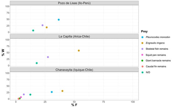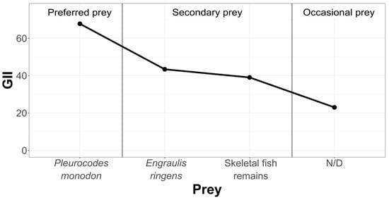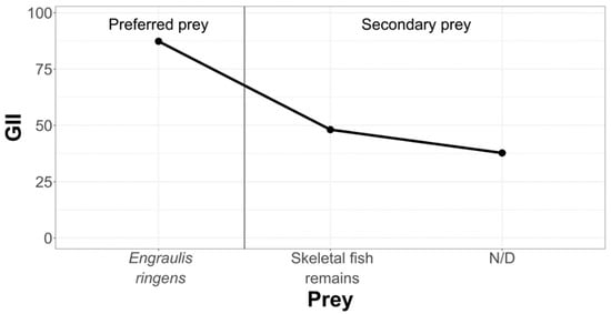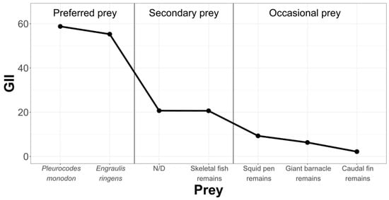 The obtained data show that, in the three study areas, the diet is not diverse, although in the Chanavayita area, the Shannon Index value was slightly higher than in the other two study areas, indicating that there is a greater diversity of prey offered by the environment (7 prey items). Labropoulou et al. [] studied the feeding habits of fish off the Greek coast, finding that their diet in most of the species is composed of a narrow range of prey, as presented by Sarda chiliensis chiliensis in this study, which was reflected in a low Shannon Diversity Index. Thus, it comes as no surprise why they consider these species to be specialists. They qualify, however, in that the dietary breadth increased with the size of the fish, which would indicate a tendency to a more generalist feeding during the later stages of growth. These data are in agreement with ours, since the individuals studied in the present investigation are adult specimens.