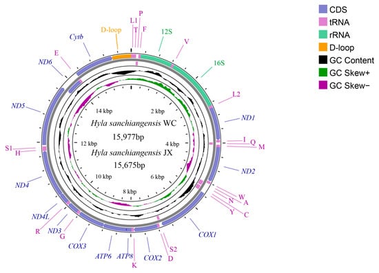 Mitogenomes are currently used as an efficient tool for species identification and the analysis of phylogenetic relationships [,]. The length of frog mitogenomes is about 15–23 kb [,,,] and encodes 22 transfer RNAs (tRNAs), two ribosomal RNAs (12S and 16S RNAs), 13 protein-coding genes (PCGs), and the control region (CR) or D-loop region. As a result of their relatively conserved gene content, rapid evolutionary rate, small size, maternal inheritance, and limited recombination, mitogenomes have been widely used for studies of conservation biology, species delimitation, and the evolution of the Anura [,,]. Using the mitogenome to study phylogenetic relationships is an efficient tool to analyze problems in taxonomy. In addition, further studies have found that mtDNA has evolved a variety of unique properties that enable this genome to be used as a cellular sentinel for genotoxic stress. []. Based on all of these factors, samples of H. sanchiangensis were collected from different sites to conduct a basal study and evaluate the specific differences in the characteristics of H. sanchiangensis from two different sites. These data allowed us to further explore the phylogenetic relationship of H. sanchiangensis among Hylidae.
