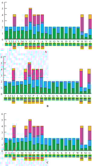 The nucleotide AT% composition of the PCGs for both newly sequenced H. sanchiangensis mitogenomes (Wencheng and Jinxiu) was 59.6% and 59.8%, respectively. We calculated the relative synonymous codon usage (RSCU) of the 13 protein-coding genes from the two samples, excluding stop codons. This data is summarized in Figure 2, along with the mitogenome of H. sanchiangensis from Lishui. The RSCU showed that codons that had base A or T in the third position were consistently overused as compared to the other synonymous codons. The frequency of amino acid usage was almost the same among the three analyzed mitogenomes (Figure 2). For the mitogenomes of Wencheng and Jinxiu, Leu (CUR), Ala (GCR), and Ile (AUR) (>300) were the most frequently encoded amino acids, and Cys (UGR) (<45) was the least frequently used amino acid. This was similar to the mitogenome of H. sanchiangensis from Lishu []. Fourteen amino acids had two kinds of codons, whereas Ala, Arg, Leu, Ser, Val, Pro, Thr, and Gly had four kinds of codons. These results indicated that the RSCU of the three mitogenomes was highly conserved.