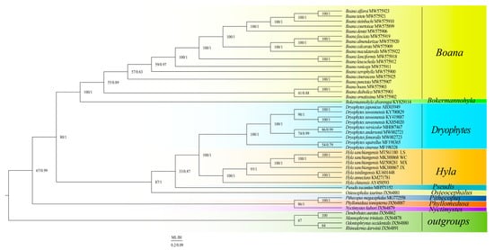 Despite numerous studies, the phylogenetic relationships among Hylidae are still controversial, and full confirmation of the monophyly of the genus Hyla and the genus Dryophytes using mitogenomes still needs full confirmation. Dryophytes were long treated as a subgenus of Hyla [], but Duellman et al. [] suggested that the species belonging to the genus Hyla should now be divided into two genera: Hyla and Dryophytes; subsequent research by Zhang et al. also supported this view []. Therefore, it is necessary to further study whether Dryophytes and Hyla are monophyletic and show the relationships between these two clades. Li et al. [] supported H. annectans and H. tsinlingensis as clustering into one clade. However, Lee et al. [] found that H. tsinlingensis and H. suweoninsis were sister clades.