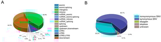 SNP characteristics of indigenous pig population. (A) This figure shows the annotation of all variations within the three indigenous pig populations, with each variation area annotated as a percentage. (B) This figure displays the annotated variation information within the coding region of the three indigenous pig populations.