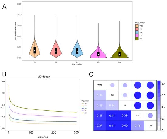 Genetic diversity refers to the range of alleles and genotypes that exist within the studied population []. Various parameters are used to describe genetic diversity, which are useful indicators in population genetics. In this study, multiple indicators were employed to estimate the genetic diversity of indigenous pigs. VCFtools and Plink (v1.90) were performed to estimate the value of MAF, observed heterozygosity (HO) and expected heterozygosity (HE) [], and pi values were calculated to evaluate nucleotide polymorphism. The genetic diversity parameters were statistically analyzed using violin plots generated with the ggplot2 package in R. The degree of linkage disequilibrium (LD) decay was measured by taking the squared correlation (r2) of pairwise SNPs using PopLDdecay with default parameters [].