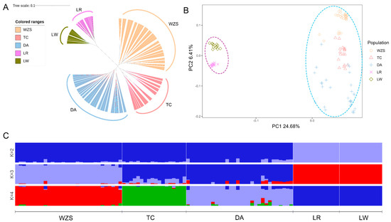 Analysis of genetic structure of the tested pigs. WZS, Wuzhishan pigs; TC, Tunchang pigs; DA, Dingan pigs; LR, Landrace pigs; LW, Large White pigs. (A) Neighbor-joining tree for all individuals. (B) Plot of the first and second principal components resulting from a principal component analysis of all pig populations. (C) The plot of population structure for all pig populations (K = 2–4). Different colors represent different clusters.