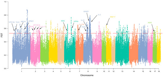 Manhattan plot of selective signatures by FST in the Chinese indigenous pigs. The red dotted line means the threshold for classifying outliers in the heat group (top 1%). Different colors are used to distinguish the neighboring chromosomes. Several related candidate genes are also highlighted.