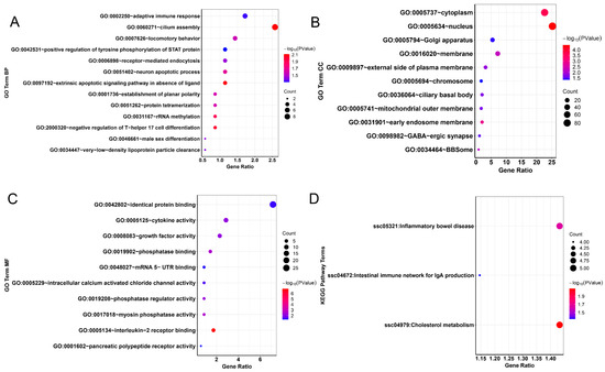 GO terms and KEGG pathways were drawn for the candidate exonic genes that were screened based on FST. (A) Bubble chart illustrating Gene Ontology (GO) Biological Process enrichment analysis results. (B) Bubble chart demonstrating Gene Ontology (GO) Cellular Component enrichment analysis findings. (C) Bubble chart highlighting Gene Ontology (GO) Molecular Function enrichment analysis outcomes. (D) Bubble chart illustrating KEGG pathway analysis results of selected candidate genes.