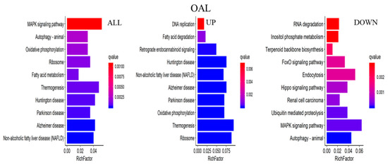 KEGG enrichment analysis of genes. The horizontal axis represents the enrichment coefficient, and the vertical axis represents the name of the pathway. The figure presents all the DEGs, the upregulated genes, and the top 10 signal pathways of the downregulated genes induced by different OA concentrations.