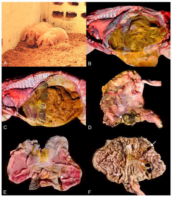 In swine, gastroesophageal ulceration affecting the pars esophagea is one of the most important conditions affecting the stomach []. While the causes of gastric ulceration remain incompletely understood, several risk factors are discussed. These include diets rich in corn and wheat, fine particle size, interruptions in feed intake, acute infectious diseases leading to reduced appetite and increased histamine levels, the use of non-steroidal anti-inflammatories, as well as Helicobacter-like organism infections, as suggested in experimental studies [,]. Ulceration of the pars esophagea typically has the highest ulceration rate in growing/finishing pigs and in sows, with mortality rates ranging from 1–2% []. However, recent studies have shown mortality rates of 15.4% and 9.9% in growing/finishing pigs and sows, respectively [,]. Yet, in the present report, the mortality rate was significantly higher, up to 23%, and the clinical, pathological, and epidemiological findings differed greatly from those seen in sporadic cases of gastric ulcers, such as those reported in the aforementioned studies [,].