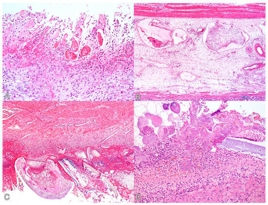 Lesions associated with ulceration of the pars esophagea rarely extend into the contiguous esophagus or the glandular region of the stomach []. Glandular stomach ulcers represent less than 1% of all diagnosed ulcers in swine, and their main causes are infectious diseases such as circovirus, transmissible gastroenteritis, salmonellosis, classic swine fever, and endoparasitosis []. In the necropsied swine from this outbreak, the ulcers were limited to the glandular mucosa, differing from the more prevalent occurrence in the aglandular mucosa (pars esophagea). Furthermore, none of the animals presented macroscopic or microscopic findings compatible with the above-mentioned infectious disease, known to sporadically result in ulceration of the glandular stomach. Moreover, gastritis in the glandular mucosa can occur secondarily to fungal infections by Rhizopus, Absidia, Mucor, and Aspergillus species. This type of mycotic gastritis is occasionally observed in piglets, typically in association with repeated antibiotic use. Lesions present as multifocal yellowish plaques on the gastric mucosa []. In our report, the animals were older, in the growing/finishing phase, and the lesions differed from the pattern observed in cases of mycotic gastritis, thereby ruling out this potential diagnosis.