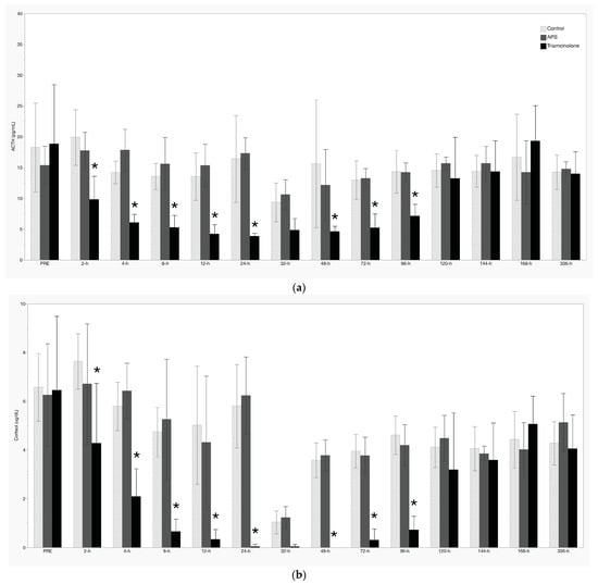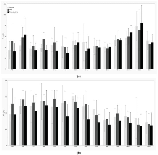 There was significant suppression of resting ACTH and serum cortisol concentrations following IA TA between 2 h and 24 h, as well as 48 h to 96 h (Figure 3a,b, respectively). Resting glucose increased significantly following TA treatment between 12 h and 48 h (Figure 3c), while insulin was increased at 32 h, 72 h, and 120 h post-IA TA (Figure 3d). There were no treatment effects noted with respect to T3, T4, or FT4d concentrations (Figure 4a–c). Additionally, there were no significant treatment effects of APS noted for any measured analyte.