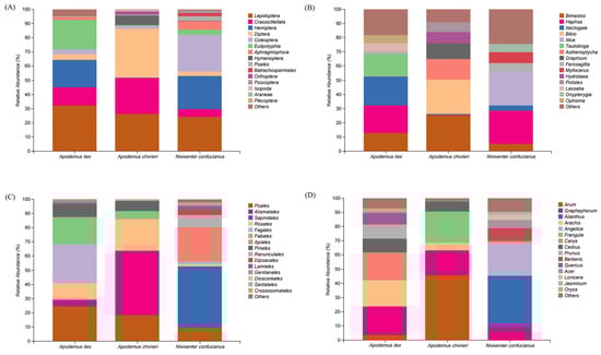 Relative abundance (RA) of the top 15 food items for three species. The components of animal-based food are classified at the (A) order and (B) genus levels, and the components of plant-based food are classified at the (C) order and (D) genus levels.