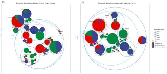 Taxonomic hierarchy tree of the dietary composition of the three species. (A) Animal-based foods; and (B) plant-based foods.