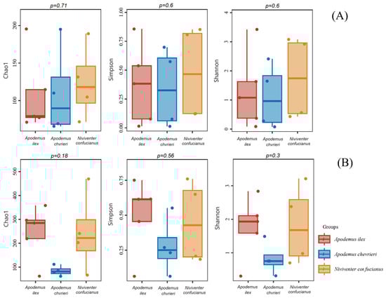 Box-and-whisker plots for α-diversity of the diet compositions of the three species. The X-axis shows sample type. The Y-axis shows the value of each diversity. The p-value for each diversity index according to the Kruskal–Wallis test is located above the box-and-whisker plots. (A) Animal-based foods; and (B) plant-based foods.