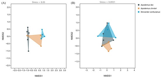 Non-metric multidimensional scaling (NMDS) of the dietary composition of the three species based on Jaccard distance. (A) Animal-based foods; and (B) plant-based foods.