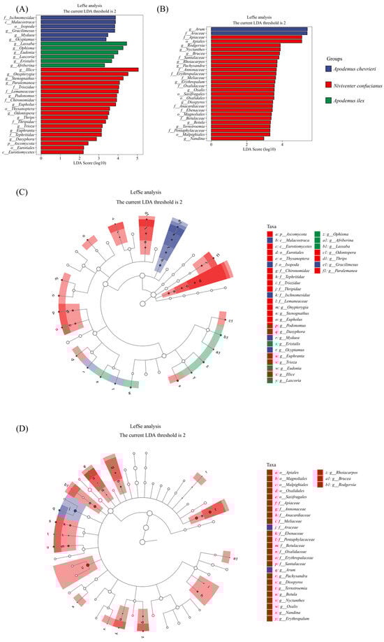LEfSe analysis identified biomarkers in the food components of the three species. LDA scores above 2 and p values smaller than 0.05 were shown. (A,B) The histogram of Linear Discriminant Analysis (LDA) scores displays distinct species (biomarkers) with significantly different abundances across the three species. The length of each bar, representing the LDA score, indicates the effect size, which is the degree to which a biomarker accounts for the phenotypic variation among the groups. (C,D) The cladogram depicts taxonomic levels from phylum to genus (species) through concentric circles, with each circle’s diameter reflecting the taxon’s relative abundance. (A,C) Animal-based foods; and (B,D) plant-based foods.
