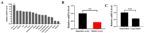 FoxO1 inhibits the development of follicles. (A) The mRNA expressions of FoxO1 in 15 tissues. (B) The mRNA expression of FoxO1 in immature and mature ovaries. (C) The mRNA level of FoxO1 in small and large follicles. N = 3, ** p < 0.01, *** p < 0.001.