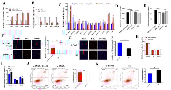 The effects of FoxO1 on cellular function and hormone levels. (A) The mRNA expression of FoxO1 after transfection of pcDNA 3.1-FoxO1. (B) The mRNA expression of FoxO1 after transfection of si-FoxO1. (C) Effect of FoxO1 on mRNA expression of genes related to steroid hormone synthesis. (D,E) Effect of FoxO1 on testosterone and progesterone secretion in GCs. (F,G) Effects of overexpression of or interference with FoxO1 on GCs proliferation. (H,I) Effects of overexpression of or interference with FoxO1 on GCs cycle progression. (J,K) Effects of overexpression of or interference with FoxO1 on apoptosis of GCs. N = 3, * p < 0.05, ** p < 0.01.