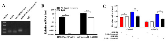 H3K27me3 regulates the transcription of FoxO1. (A,B) ChIP-qPCR validates the combination of H3K27me3 and FoxO1 promoter region, based on semi-quantitative PCR and qPCR results. (C) The effect of H3K27me3 on FoxO1 mRNA expression. N = 3, * p < 0.05, ** p < 0.01.