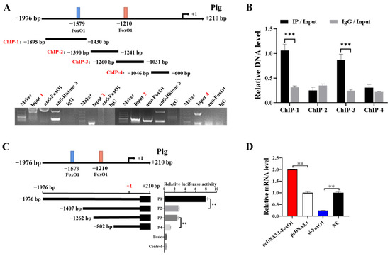 In this study, bioinformatic predictions and analyses were performed using databases dedicated to transcription factors and their binding sites, such as TFBIND, TRANSFAC [], and JASPAR []. The analysis revealed two potential binding sites for the FoxO1 transcription factor (−1579/−1569 and −1210/−1200) in the promoter region of CYP1A1. For this purpose, we segmented the promoter region of CYP1A1 and labeled ChIP-1 (−1895/−1430 bp), ChIP-2 (−1390/−1241 bp), ChIP-3 (−1260/−1031 bp), and ChIP-4 (−1046/−600 bp). The binding site of FoxO1 in the CYP1A1 promoter region was detected by ChIP, and the direct outcome revealed that FoxO1 had electrophoretic bands in both ChIP-1 and ChIP-3 regions and that the positive control (Anti-Histone 3) had bands while the negative control (IgG) had almost no bands (Figure 4A). Analysis of the PCR results revealed that FoxO1 bound more significantly in the ChIP-1 region and that the IP group bands were brighter than the Input group bands (Figure 4B). Subsequently, fluorescence activity analysis was carried out on the promoter region of CYP1A1, CYP1A1 was truncated into P1 (−1976/+210 bp), P2 (−1407/+210 bp), P3 (−1262/+210 bp), and P4 (−802/+210 bp), and significant differences in fluorescence activity were found in the P1-P1 and P3-P4 regions (Figure 4C). To further investigate the relationship between FoxO1 and CYP1A1, pcDNA3.1-FoxO1 and si-FoxO1 were respectively transfected into GCs. Compared with the control group pcDNA3.1, the overexpression of FoxO1 significantly promoted the expression of CYP1A1 mRNA in GCs. Moreover, compared with the control group NC, the expression of CYP1A1 mRNA was significantly inhibited after interfering with FoxO1 (Figure 4D). This suggests that FoxO1 can target and promote the expression of CYP1A1.