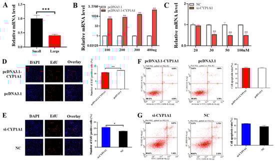 In order to explore the effect of CYP1A1 on the function of ovarian GCs, we first detected the expression of CYP1A1 in small follicles and large follicles and found that the mRNA level of CYP1A1 was higher in small follicles and significantly downregulated with follicular development (Figure 5A). In addition, we constructed eukaryotic expression vector pcDNA3.1-CYP1A1 and synthesized interference fragment si-CYP1A1, then transfected them into GCs so as to detect the changes of proliferation and apoptosis of GCs. We verified the overexpression and interference efficiency of CYP1A1, using 100 ng as the optimal transfection concentration for pcDNA3.1-CYP1A1 and 100 nM for si-CYP1A1 (Figure 5B,C). PcDNA3.1-CYP1A1 and si-CYP1A1 were transfected into GCs to detect cell proliferation and apoptosis, respectively. Figure 5D–F showed that CYP1A1 was able to inhibit the proliferation of GCs but might have no effect on the apoptosis of GCs.