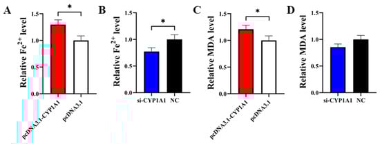 CYP1A1 inhibits GCs’ proliferation. (A,B) The effect of overexpression or interference with CYP1A1 on the Fe2+ level in GCs. (C,D) The effect of overexpression or interference with CYP1A1 on the MDA level in GCs. N = 3, * p < 0.05.