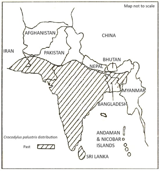 Crocodylus palustris is distributed throughout India, Sri Lanka, southern Pakistan, southern Nepal and southeastern Iran []. The area of occurrence has continuously declined and the extinction of local populations has occurred during the last few decades, with muggers being extinct in the wild in Bangladesh, Bhutan (in the 1960s) and Myanmar (the last reported sightings took place in 1867 to 1868) (Figure 1) []. Population declines have been reported in Sri Lanka, Pakistan and Iran [,,]. In India, there has been a reported rise in numbers from the 1970s due to reintroduction and protection efforts, with the country’s population estimated at 4000+ individuals [,,]. However, C. palustris populations are fragmented and isolated within its distribution, mainly due to continuous habitat destruction and fragmentation for agricultural and industrial expansion during the last few decades. There have also been constraints on reintroducing muggers from captive breeding centers in the peripheries of Protected Areas due to opposition from local communities []. The observed declines in the numbers, range size and availability of quality habitats has led to the mugger being classified as “Vulnerable” by the IUCN.
