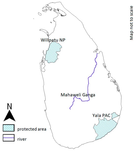 At present, the mugger is mostly confined to the first peneplain of Sri Lanka (Figure 2) in the dry zone below 100 masl []. It inhabits freshwater streams, rivers, canals, tanks and even hyper-saline estuaries []. There appears to be a 60% decline in muggers during the past 20 years in the country []. Madawala et al. reported the presence of muggers in all 10 administrative districts of the island []. Sentapillai and de Silva have reported sightings from 104 locations []. The most important regions in crocodile conservation in Sri Lanka are Protected Areas, particularly the Wilpattu National Park and Yala Protected Area Complex. During the previous study, 500–600 adult and sub-adult muggers inhabiting Block One of the Yala National Park were observed []. Over 100 muggers were recorded in the Katagamuwa tank alone. This tank is situated close to Block One of Ruhuna National Park [].
