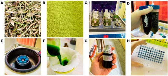 (A) Fresh olive leaves. (B) Ground and sieved olive leaves. (C) Extraction of phenolic compounds using different solvents in an orbital shaker. (D) Extracts obtained after shaking, transferred to Falcon tubes for centrifugation. (E) Centrifugation of the extracts. (F) Collection of the supernatants. (G) Extracts stored in amber flasks. (H) Quantification analyses of phenolic compounds.