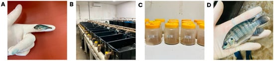 (A) Juvenile Nile tilapia at the start of the experimental trial. (B) Arrangement of tanks in the recirculating aquaculture system. (C) Containers used for diet storage and daily weighing to monitor feed intake. (D) Juvenile Nile tilapia at the end of the experimental trial.