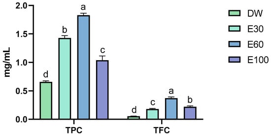 The TPC and TFC values of the extracts obtained using the different solvents are shown in Figure 3. The highest levels of TPC (1.82 ± 0.03 mg/mL) and TFC (0.37 ± 0.02) were observed in the extract obtained with E60, which was selected for the formulation of experimental diets.
