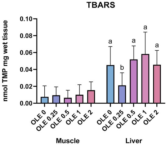 Lipid peroxidation (TBARS) in the muscle and liver of fish is shown in Figure 4. Muscle TBARS levels were not affected by diet (p > 0.05). On the other hand, in the liver, a reduction was observed in the OLE0.25 group (p < 0.05).