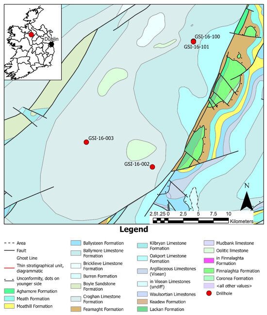 The geological map of the North-West Midlands area, published by the Geological Survey of Ireland in 2019, is supported by borehole logs and samples for micropalaeontological studies [,]. Original data gathered for the mapping of the North-West Midlands resulted in summary logs for 32 boreholes and highly selective sample sets. The logging focused on the lithostratigraphy, specifically the changes in lithologies. The sampling focused on the biostratigraphy, targeting lithologies in facies suitable for micropalaeontological studies.