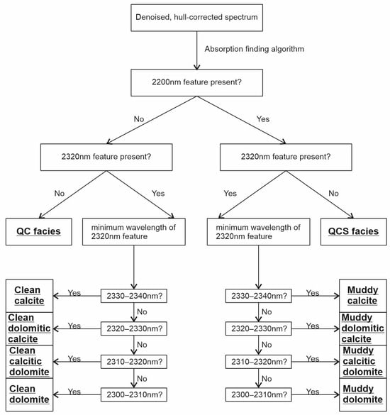 The wavelength positions of carbonate absorption features in SWIR data have been shown to be unaffected by grain size variation [,]. For this reason, we consider it appropriate to use the wavelength position of the 2320 nm feature as part of the facies definition.