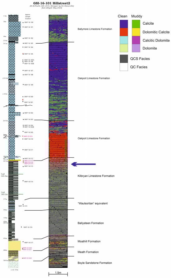 The Kilbryan Limestone Formation (MFZ 8) shows a muddy dolomitic calcite facies with QCS facies in boreholes GSI-16-101 and GSI-16-002. In borehole GSI-16-003, Carrowreagh, the Kilbryan Limestone Formation comprises c.20 m of dolomitised, dark-grey, fine-grained, argillaceous limestone. The HS response shows a dominantly clean dolomitic calcite–clean dolomitic calcite facies. Although dolomitic in all three boreholes, the cleaner limestone in the Carrowreagh borehole was drilled higher up on the shelf, with less “mud” input from the tectonic high east of the Strokestown Fault.