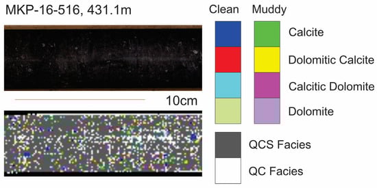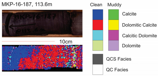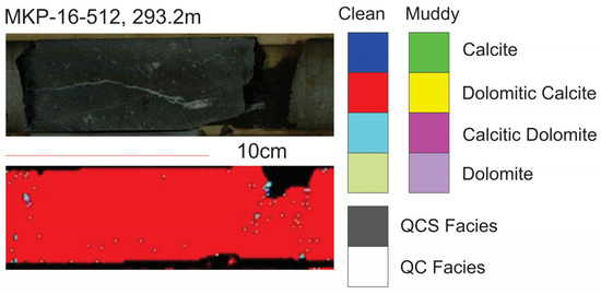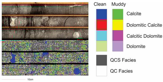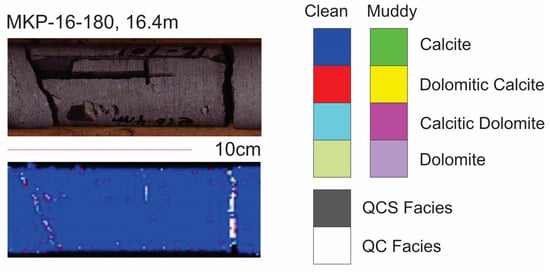Hyperspectral facies log: In this hole, the formation is dominated by the QCS and QC facies with thin intervals of clean or muddy dolomitic calcite facies (Figure 4).