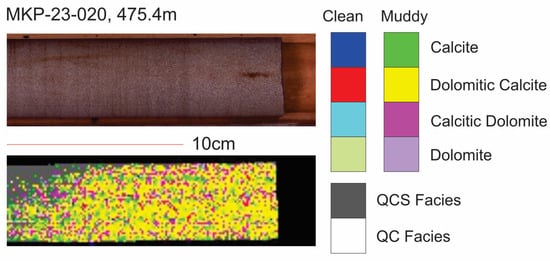 Hyperspectral facies log: This formation is dominated by the QCS facies with intervals up to 1 m of muddy calcite facies and thin intervals of clean dolomitic calcite facies (Figure 4).