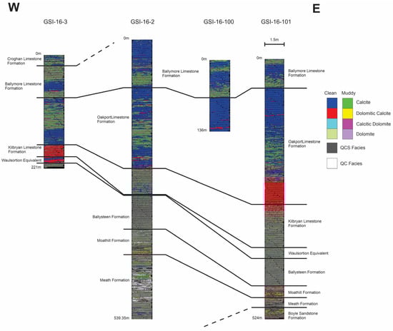 To summarise, a transition in the facies distribution from west to east can be seen in these four holes. The Ballymore Limestone Formation consists of intercalations of muddy and clean calcite facies, but the pattern is not consistent between holes, suggesting that these facies are not laterally continuous. The Oakport Limestone Formation becomes thicker from west to east, but it consistently has clean calcite facies at the top and base of the unit, with a region of muddy calcite facies in the centre. The muddy calcite centre becomes more quenched towards the east, and the lower clean region is more dolomitic in the east. The Kilbryan is dominantly clean dolomitic calcite in the west but transitions to dominantly quenched facies with small intervals of clean calcite facies becoming smaller further east. The distal Waulsortian facies interval is clean in the west, both calcite and dolomitic calcite facies, but it transitions eastward into mixed quenched and muddy calcite facies.