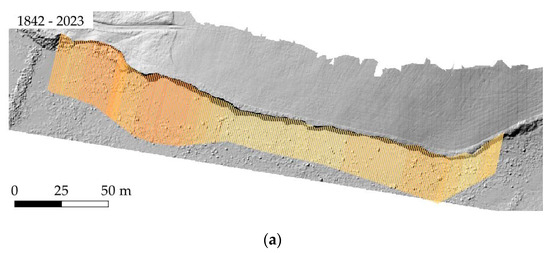 We applied the M3C2 algorithm to the five periods listed in Table 3. This algorithm compares two PCs directly, without previous meshing or gridding [62], thereby enabling us to detect specific areas that experienced material loss or gain over time. Since most higher parts of the cliff face are nearly vertical, areas indicating net gain most likely reflect higher registration errors [13]. These areas were excluded from the calculation of erosion and cliff face retreat rates accordingly. Where any apparent change in the position on the cliff face was less than the error of the registration, we assumed that no significant change was detectable within the calculated certainty [62].
