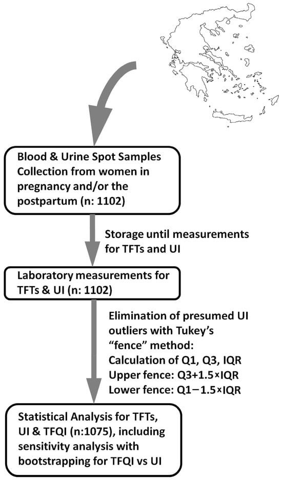 Tukey’s inter-quartile range (IQR) “fence” method was used to indicate and exclude possible outliers in the UI values [] (Figure 1). For the statistical analysis of TSH, fT4, UI and the TFQI by each time period, analysis of variance (ANOVA, with Tukey’s/Kramer’s post hoc testing) was used; the rate of anti-TPO positivity by trimester was assessed with the Chi square test; for UI by anti-TPO positivity and trimester, two-way ANOVA was used; and Pearson’s correlation was used to assess TSH, FT4, and the TFQI versus UI. Analysis was conducted mainly with JASP (Version 0.18.3; [Computer software]; JASP Team 2024, University of Amsterdam, Nieuwe Achtergracht 129B, Amsterdam, The Netherlands). For sensitivity analysis of our results, we also conducted a bootstrapped correlation analysis of the TFQI vs. UI after 1000 iterations [using the Resampling Procedures software (v.1) of Prof. Howell, D.C., University of Vermont, 2007; available at https://www.uvm.edu/~statdhtx/StatPages/Resampling/Resampling.html, accessed on 24 September 2024]. The Elena Venizelou Hospital’s Ethics Committee/Scientific Governance Council reviewed and approved the study protocol (No. 18/2019). All participants provided informed consent prior to their inclusion in this study.
