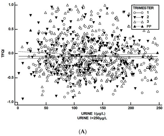 Scatter plots with ordinary least squares (OLS) regression lines for the TFQI vs. urine iodine (UI) levels up to 250 μg/L (A) and above 250 μg/L (B) during each trimester and the postpartum period (PP). Note: In the postpartum period, only one UI measurement exceeded 250 μg/L, precluding OLS regression for this time period.