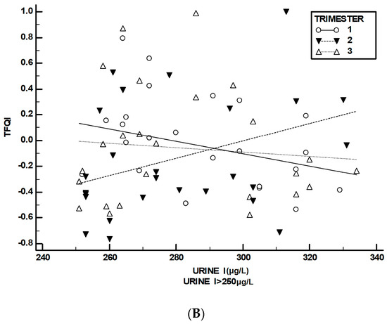 The TFQI vs. UI correlation was negative and marginal (Pearson r: −0.323, p: 0.093) for UI values over the threshold of 250 μg/L in the first trimester. In contrast, a positive and significant correlation was found in the second trimester for UI values exceeding 250 μg/L (r: +0.368, p: 0.050) (Figure 2).