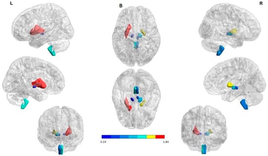 For patient analysis, the atlas was constructed by co-registering the atlas proposed by Oishi et al., which includes 74 brain structures including cortical and subcortical structures []. Taking into account that the seizure onset side differs in these patients, the ipsilateral and contralateral hemisphere to the seizure onset side were used to flip the MRI/SPECT scans so as to achieve comparability. The ipsilateral regions to the seizure onset zone (SOZ) were visualized in the right hemisphere in the figures shown. The ROIs were pictured with the BrainNet Viewer (http://www.nitrc.org/projects/bnv/, accessed on 25 April 2022) [].