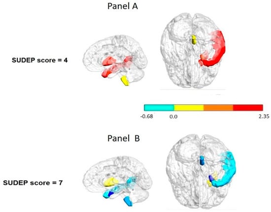 Interictal to ictal change pattern per regions considered as possible biomarkers of the SUDEP-7 risk. Panel (A): lower risk patient. Panel (B): higher risk patient. Notice that the patient with the highest SUDEP-7 score showed no change in the transition from the interictal to ictal state in the putamen entorhinal cortex and temporal middle gyrus (in blue). These structures were identified as potential biomarkers of SUDEP risk using feature selection and a variable screening methodology. The color bar to indicate the normalized scale change.