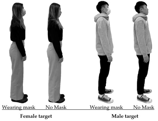 Two individuals, a 22-year-old male and a 22-year-old female, both with typical Taiwanese features, were selected as the targets for this study. This is because the study simulated an IPD examination on a university campus where the majority of students are Taiwanese. Both Taiwanese and Southeast Asian students can easily discern the distinctions in appearances between Taiwanese and non-Taiwanese individuals. The male had a height of 176 cm, while the female stood at 160 cm (Figure 2). These targets were dressed in everyday attire without any additional accessories. In order to create digital representations of these targets for the online survey, a digital camera (Sony HDR-XR260; Sony, Tokyo, Japan) was utilized to capture sagittal views of both the male and female targets in two distinct mask-wearing conditions. Throughout the image capture process, the targets were instructed to maintain a neutral expression. Subsequently, these photographs were integrated into the online survey. The digital representations of the male and female targets as displayed on the screen were proportionally scaled down to dimensions of 24.4 cm and 22.1 cm, respectively. The surgical masks used in the study were standard blue masks, devoid of any decorative elements, consistent with the type of face masks typically recommended during the COVID-19 pandemic.