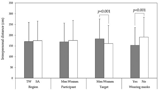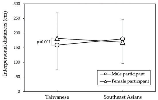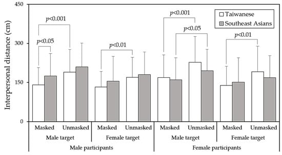 Specifically, Taiwanese young women maintained a larger IPD (p < 0.001), while Southeast Asian young women displayed a contrasting trend compared to men, although it did not reach statistical significance (p = 0.066). Zhou et al. [] reported a connection between social interaction distance and perceptual judgments on social grouping, noting that female participants tended to maintain a greater distance in mixed-sex dyads due to feelings of insecurity and shyness []. However, in our study, this phenomenon was observed exclusively among Taiwanese participants. This suggests that, in comparison to young Taiwanese women, who tend to be more conservative in their approach to strangers, there was no significant difference between male and female students from Southeast Asia. Moreover, while both groups exhibited a preference for larger IPD when encountering male and masked targets, cross analyses revealed that only Southeast Asian female participants displayed a significantly larger IPD when facing unmasked male targets (Figure 6). In contrast, Taiwanese participants exhibited significant effects of mask wearing on IPD for both genders. Despite findings from a comprehensive cross-national study (n = 14,000) indicating a 54% global increase in preferred IPD during the COVID-19 pandemic across all types of relationships and countries [], our study observed that the IPD was still influenced by various determining factors between different regional populations.