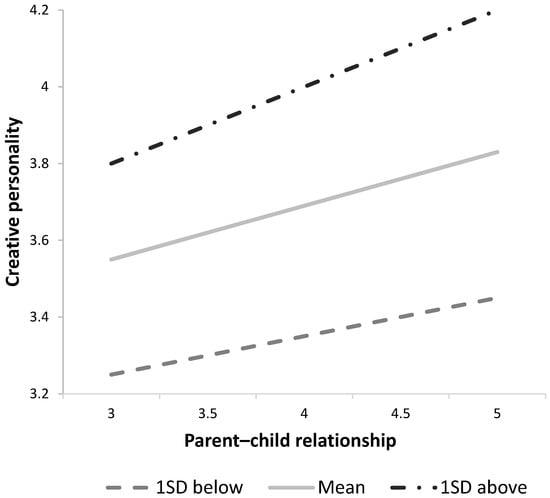 Second, the self-concept of middle school students was found to moderate the relationship between perceived parent–child relationship and creative personality. In other words, the interaction between the perceived parent–child relationship and self-concept significantly influenced creative personality, indicating that the higher a middle school student’s self-concept, the greater the impact of the perceived parent–child relationship on creative personality. This supported existing theories of creativity, suggesting that intrinsic motivation can serve as an internal force for generating creative ideas or engaging in creative activities [,]. According to Amabile’s Componential Theory of Creativity [], creativity can manifest through the interaction of social environmental factors and individual internal motivation. Consistent with this, this study also showed that the relationship with parents (an environmental factor) and self-concept (an individual factor) influenced the enhancement of creativity. These results can be understood in the context of studies showing that students with a high self-concept were more likely to perceive their relationship with their parents positively [] and exhibited a higher level of creative personality and creativity [,,]. Students with a high self-concept evaluate and perceive themselves positively, possessing an active motivation to solve problems. Thus, even when encountering difficulties in everyday life, they exhibit resilience based on the perceived stable emotions and support received from their parents, demonstrating a connection to creative personality and creativity in seeking to solve problems in new ways.